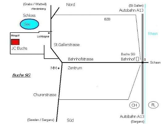 - ab Autobahn Richtung Grabs, dann wieder Richtung Buchs zur St. Gallerstrasse
